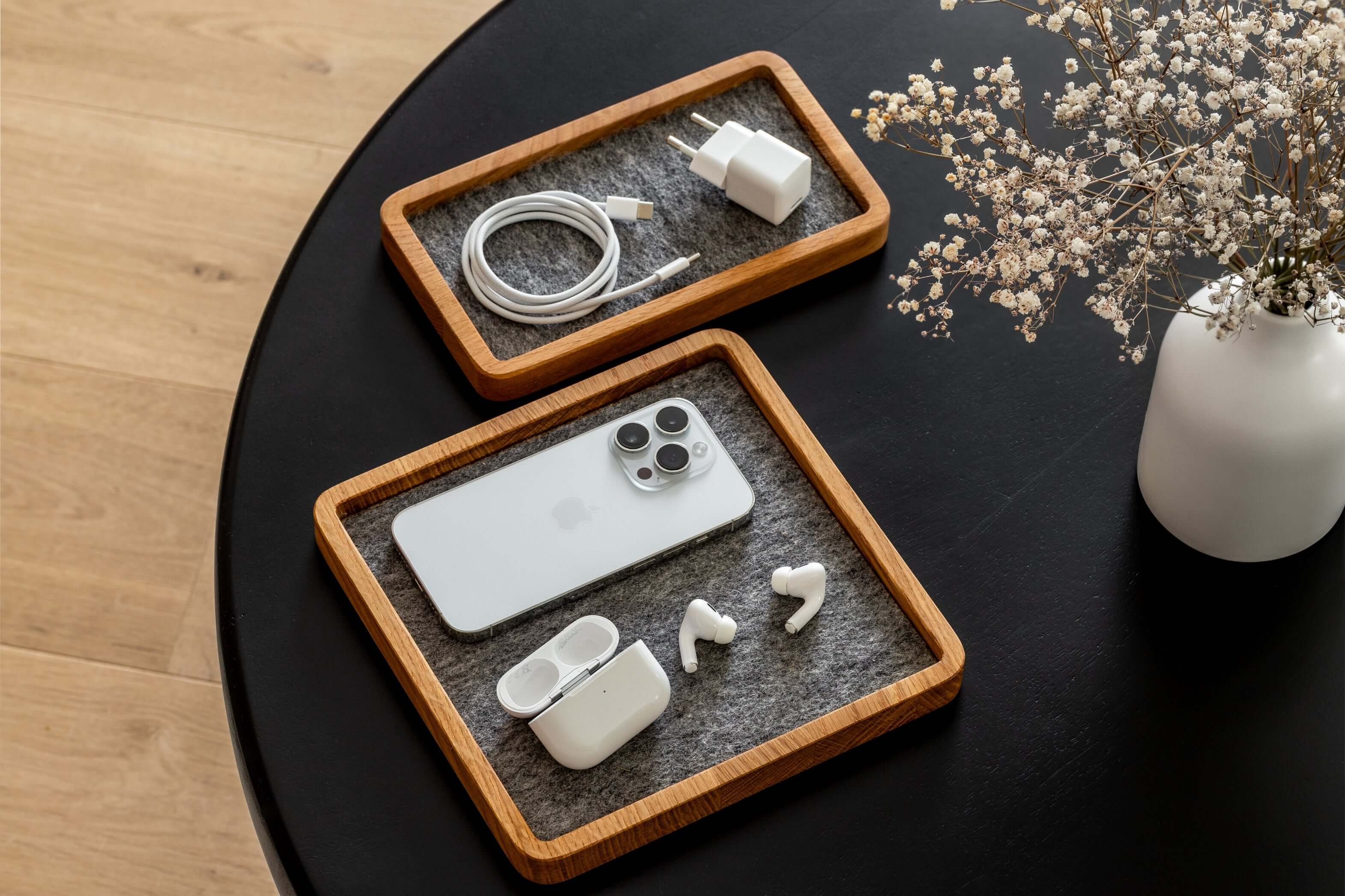 Praktyczna kwadratowa tacka zaprojektowana do organizowania większych niezbędnych rzeczy na biurku, takich jak notatniki, tablety lub ładowarki. Idealna do utrzymania porządku w miejscu pracy, a jednocześnie zapewniająca eleganckie rozwiązanie do przechowywania codziennych przedmiotów