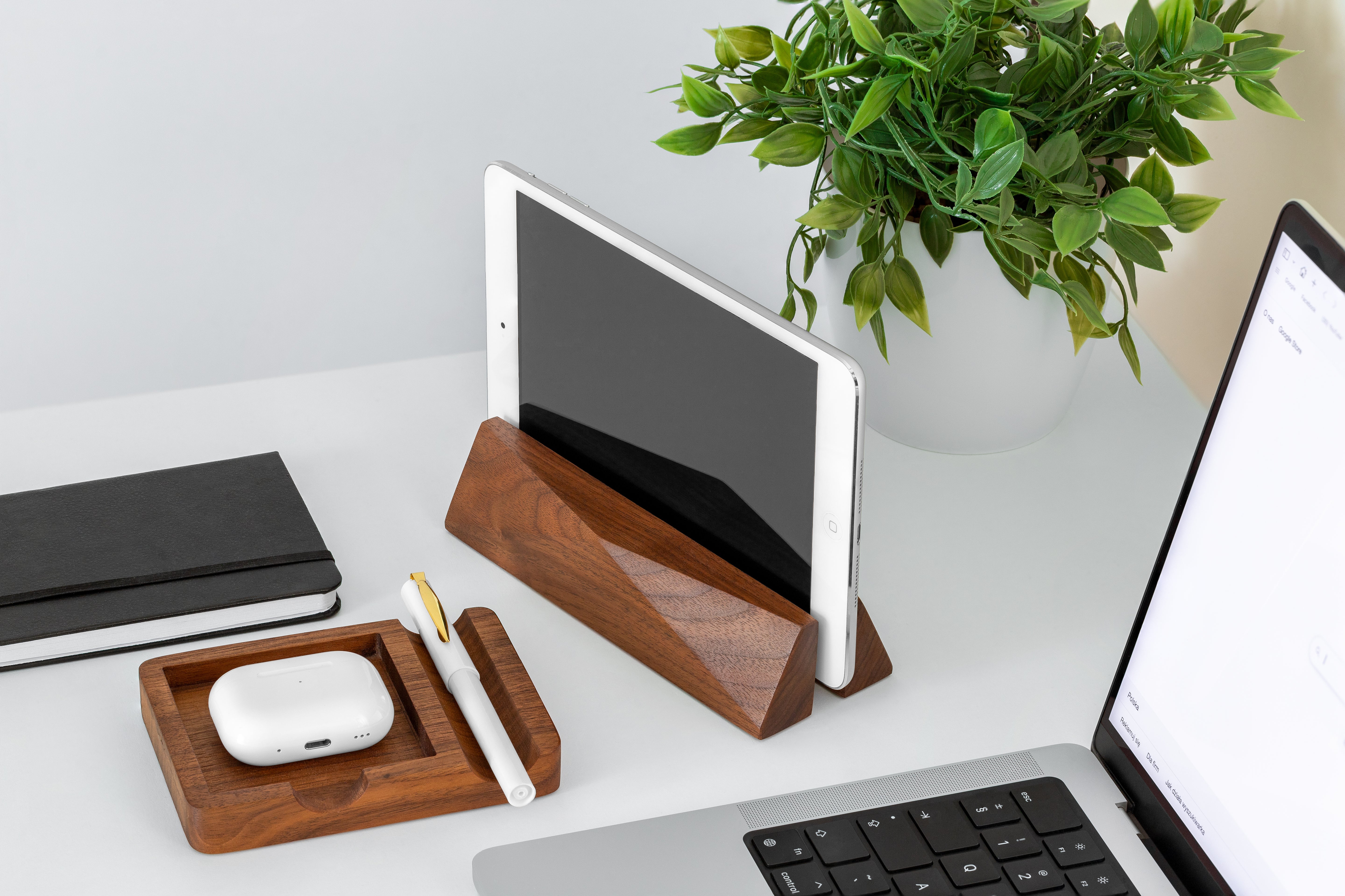 Made from walnut wood, this laptop dock shows the natural dark brown color and wood grain. The vertical design saves desk space and looks great in any workspace. This laptop dock is a practical solution for anyone who wants to organize their desk while adding a natural wood accent to their setup.